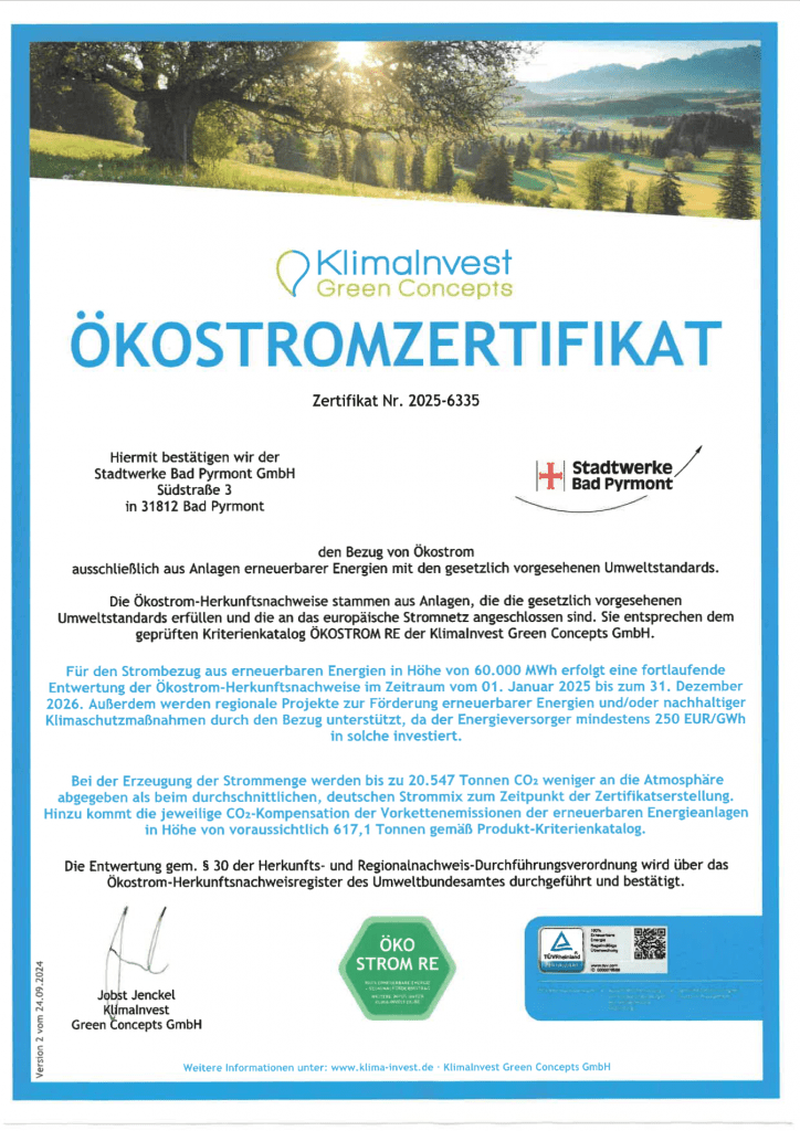 Dank unseres Bezugs von Ökostrom ausschließlich aus Anlagen erneuerbarer Energien – zertifiziert von den Stadtwerken Bad Pyrmont – ist für uns die Realisierung des Lichterfests mit einem unterdurchschnittlich hohem Energieeinsatz möglich.